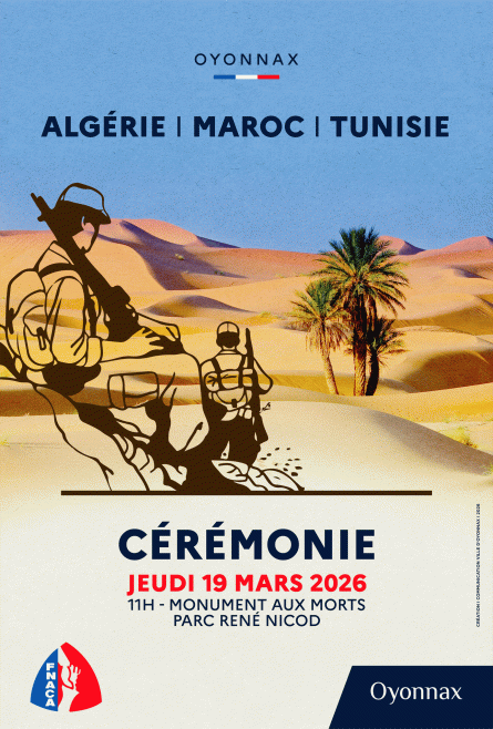 La Ville d’Oyonnax et le comité F.N.A.C.A des cantons d’Oyonnax convient les habitants à participer à la cérémonie du souvenir et du recueillement à la mémoire des victimes, civils et militaires morts pour la France lors de la Guerre d’Algérie et des combats en Tunisie et au Maroc.